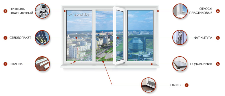 Окна ПВХ – это светопрозрачная конструкция, состоящая из нескольких элементов: