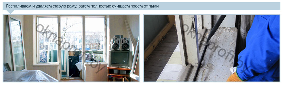 Демонтаж старой конструкции. Изначально снимаются створки, после демонтируются отделка окна и сама оконная рама, а так же отлив и подоконник. В большинстве случаев демонтаж производится без сохранения целостности рамы. При необходимости демонтируются и откосы. Таким образом, оконный проём полностью освобождается для нового окна.